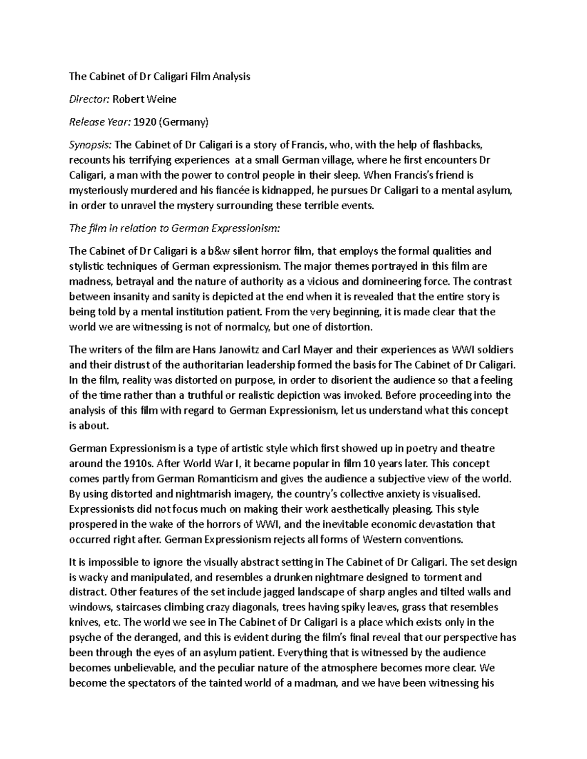 The of Dr. Caligari (1920) Posters — The Movie Database (TMDB). But there is a framing-story which makes the whole tale the ravings of a lunatic in an asylum. The film follows the story of a young man named Francis who becomes involved in a series of mysterious murders in a small German town.